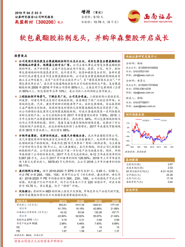 【西南证券】【20190403】高盟新材-300200.SZ-软包氨酯胶粘剂龙头,并购华森塑胶开启成长-23页 行业研究