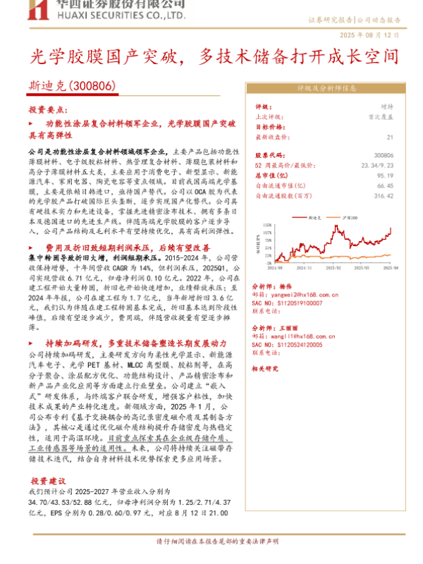 【华西证券】【202508】斯迪克(300806)光学胶膜国产突破,多技术储备打开成长空间-14页 证券期货研究报告