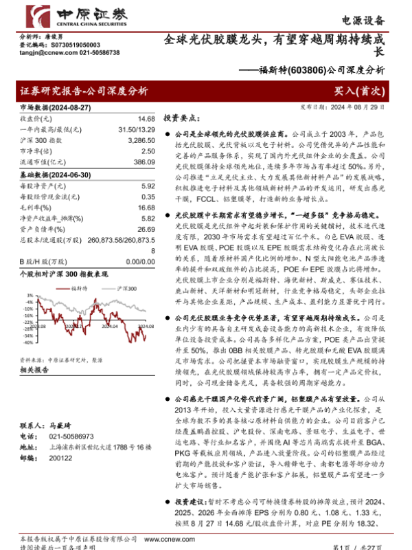 【中原证券】【20240829】20240829-中原证券-福斯特-603806.SH-公司深度分析:全球光伏胶膜龙头,有望穿越周期持续成长-27页 行业研究