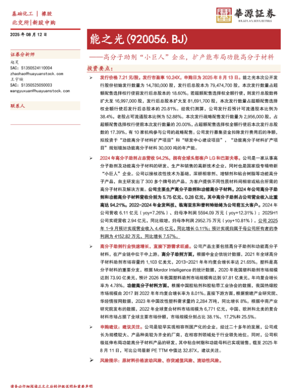 【华源证券】【202508】能之光(920056)高分子助剂“小巨人”企业,扩产能布局功能高分子材料-19页 证券期货研究报告