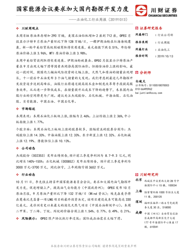 【川财证券】【20191013】石油化工行业周报:国家能源会议要求加大国内勘探开发力度-12页 行业研究