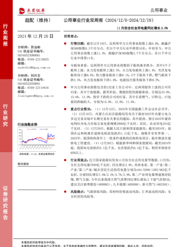 【东莞证券】【20241220】公用事业行业双周报:11月份全社会用电量同比增长2.8%-10页 行业研究