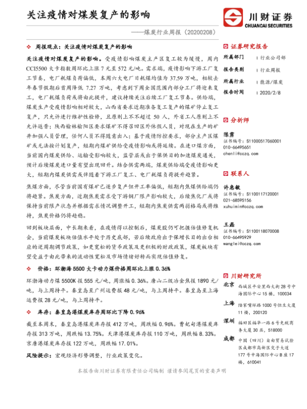 【川财证券】【20200208】煤炭行业周报:关注疫情对煤炭复产的影响-15页 证券期货研究报告
