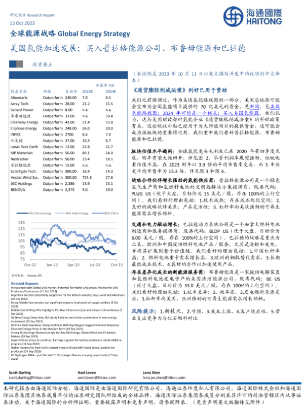 【海通国际】【20231013】全球能源行业战略:美国氢能加速发展,买入普拉格能源公司、布鲁姆能源和巴拉德-40页 行业研究