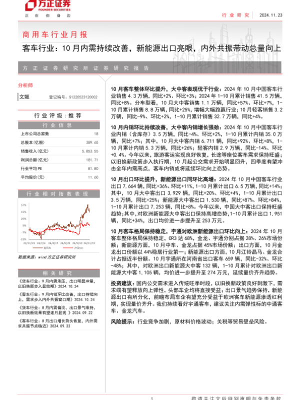【方正证券】【20241123】商用车行业月报-客车行业:10月内需持续改善,新能源出口亮眼,内外共振带动总量向上-14页 行业研究