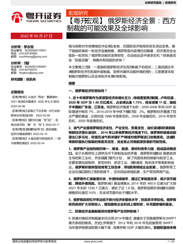 【粤开证券】【20220227】【粤开宏观】俄罗斯经济全景:西方制裁的可能效果及全球影响-25页 行业研究