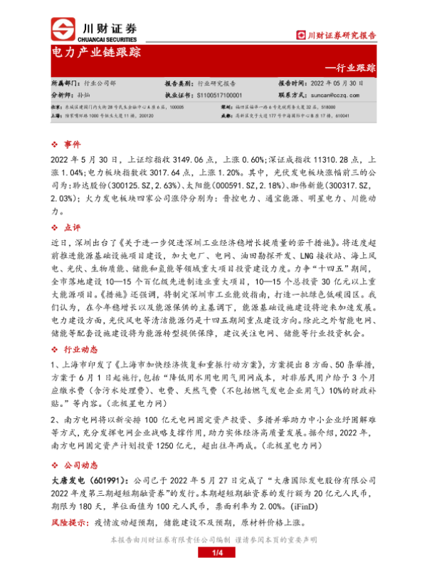 【川财证券】【20220530】电力产业链跟踪-4页 证券期货研究报告