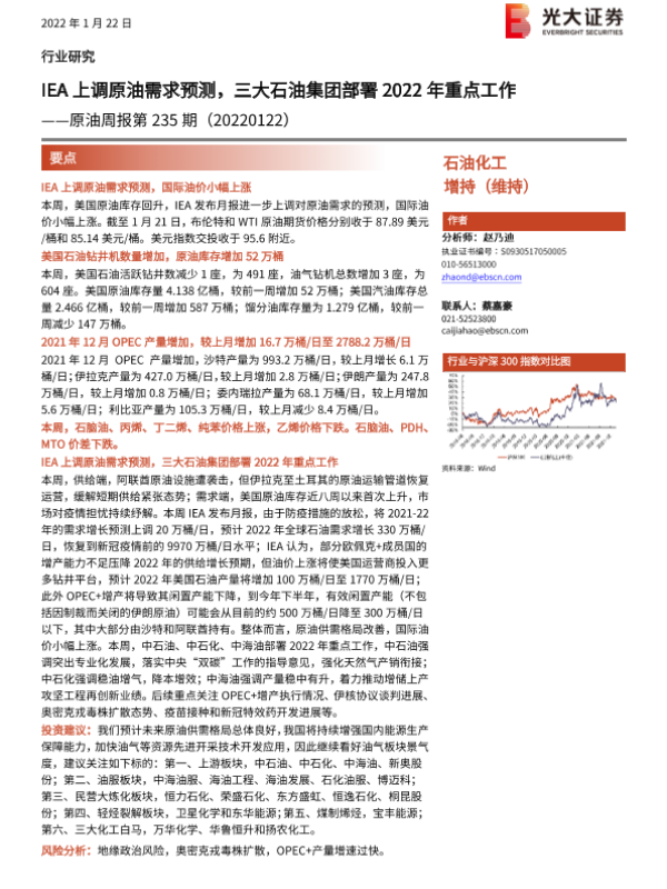【光大证券】【20220122】原油周报第235期:IEA上调原油需求预测,三大石油集团部署2022年重点工作-11页 行业研究