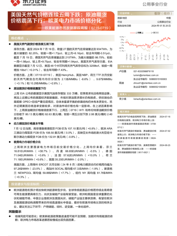 【东方证券】【20240725】欧美能源市场数据跟踪周报-12页 行业研究