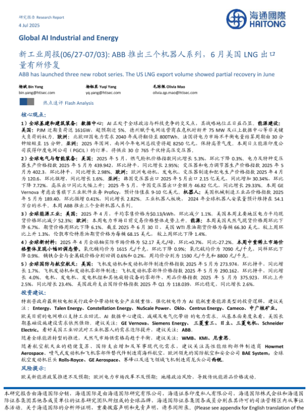 【海通国际】【20250704】新工业周报:ABB推出三个机器人系列,6月美国LNG出口量有所修复-40页 行业研究