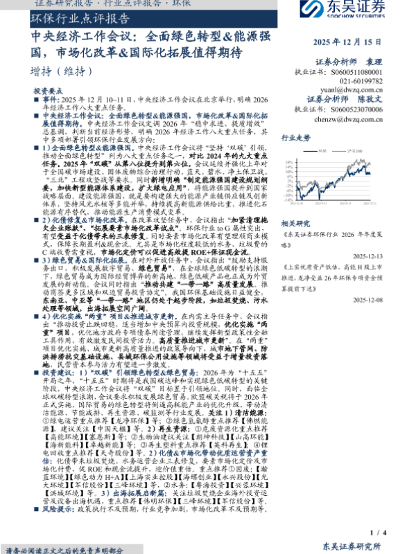 【东吴证券】【202512】环保行业点评报告·中央经济工作会议:全面绿色转型&能源强国,市场化改革&国际化拓展值得期待-4页 证券期货研究报告