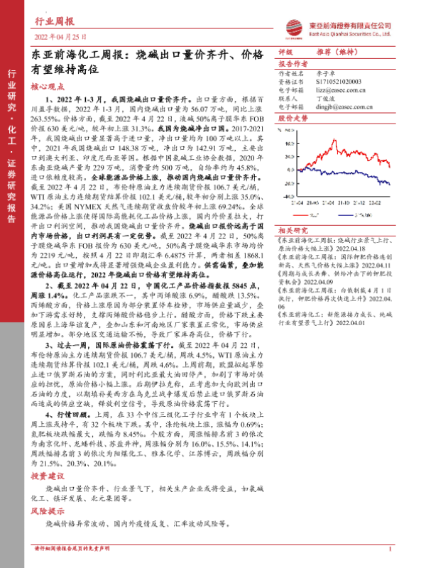 【东亚前海证券】【20220425】东亚前海化工周报:烧碱出口量价齐升、价格有望维持高位-20页 行业研究