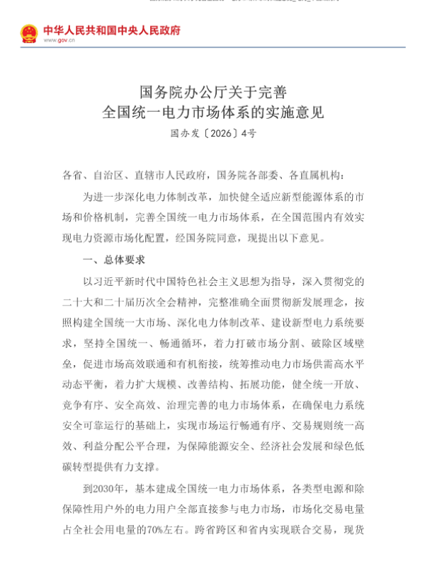 【国务院办公厅】【2026】国务院办公厅关于完善全国统一电力市场体系的实施意见-8页 政策文件