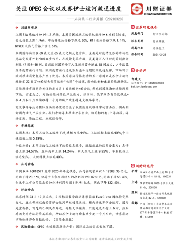 【川财证券】【20210328】20210328-川财证券-石油化工行业周报:关注OPEC会议以及苏伊士运河疏通进度-12页 行业研究