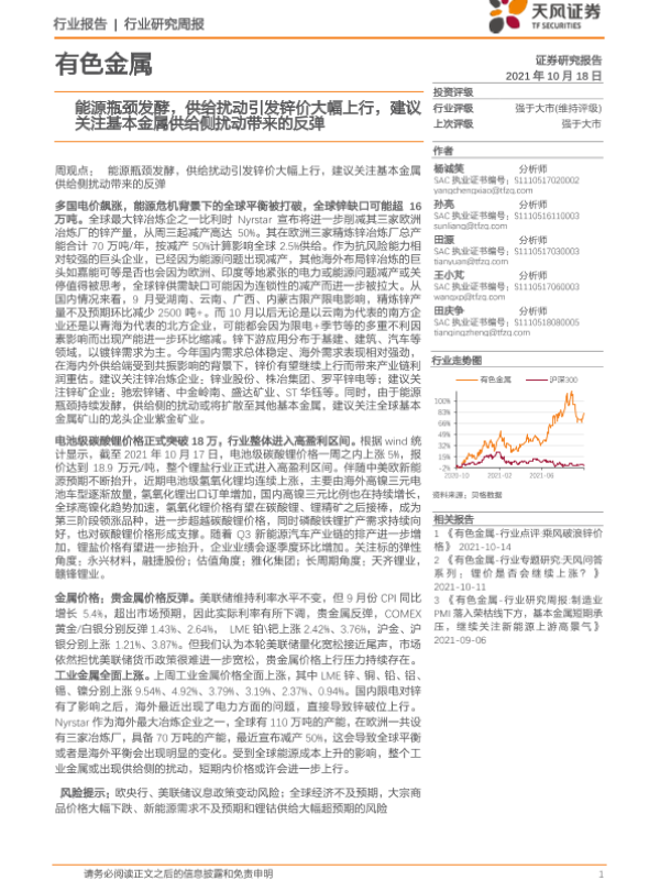 【天风证券】【20211018】20211018-天风证券-有色金属行业研究周报:能源瓶颈发酵,供给扰动引发锌价大幅上行,建议关注基本金属供给侧扰动带来的反弹-13页 行业研究