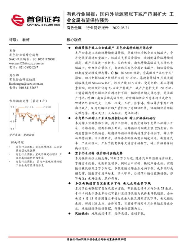 【首创证券】【20220821】20220821-首创证券-有色行业周报:国内外能源紧张下减产范围扩大 工业金属有望保持强势-22页 行业研究