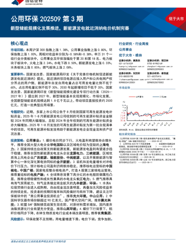 【国信证券】【202509】公用环保202509第3期:新型储能规模化发展推进,新能源发电就近消纳电价机制完善-30页 证券期货研究报告
