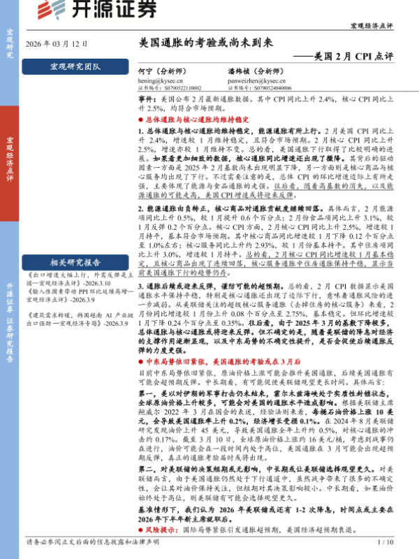 【开源证券】【202603】美国2月CPI点评:通胀的考验或尚未到来-10页 证券期货研究报告