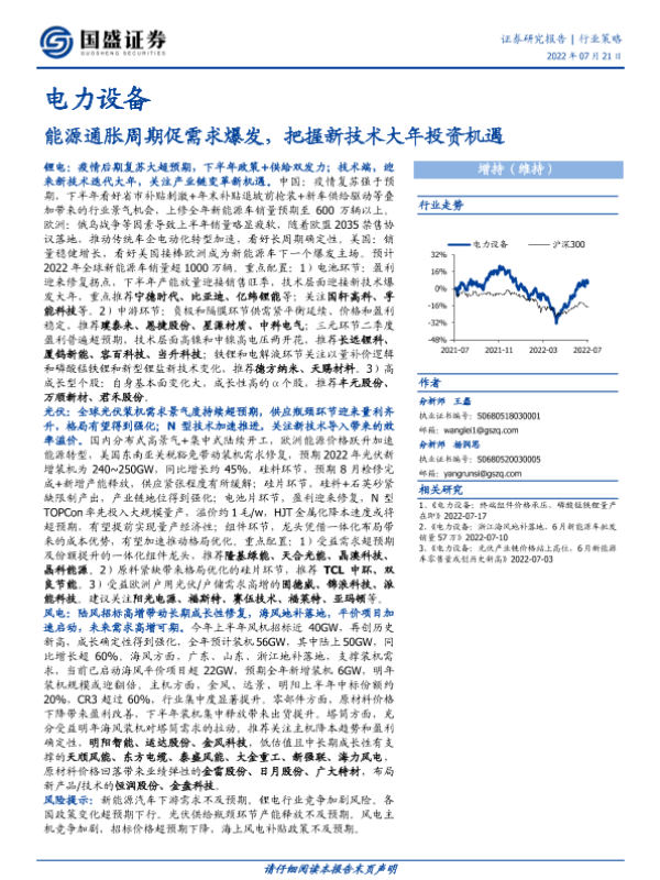 【国盛证券】【20220721】电力设备行业策略:能源通胀周期促需求爆发,把握新技术大年投资机遇-86页 行业研究