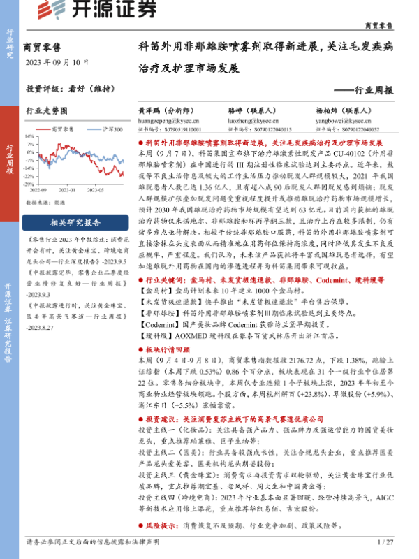 【开源证券】【20230910】开源证券商贸零售行业周报:科笛外用非那雄胺喷雾剂取得新进展,关注毛发疾病治疗及护理市场发展-27页 行业研究