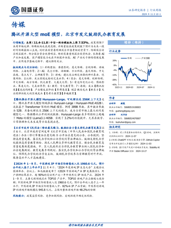 【国盛证券】【20241110】20241110-国盛证券-传媒行业周报:腾讯开源大型moE模型,北京市发文鼓励民办教育发展-10页 行业研究