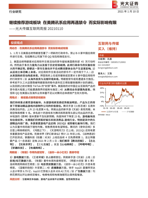 【光大证券】【20210110】20210110-光大证券-光大传媒互联网周报:继续推荐游戏板块 在美腾讯系应用再遇禁令 而实际影响有限-12页 行业研究