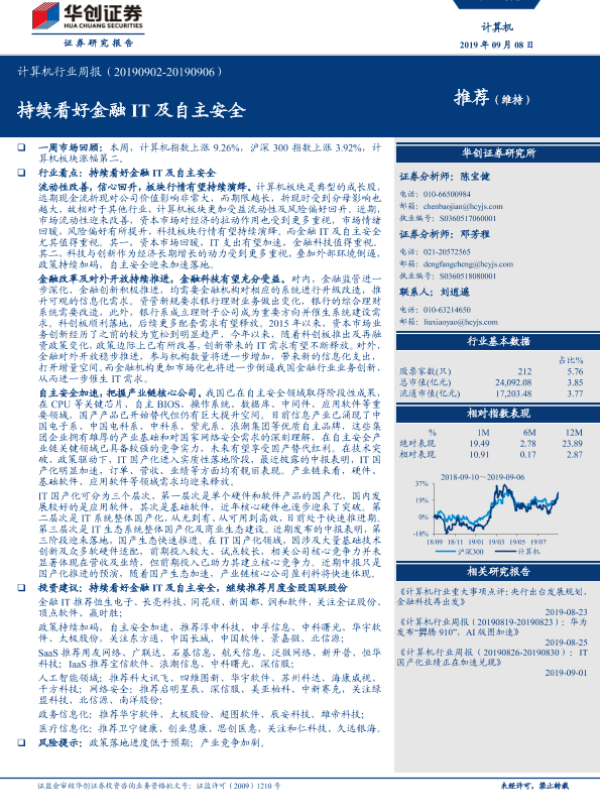 【华创证券】【20190908】计算机行业周报:持续看好金融IT及自主安全-19页 行业研究