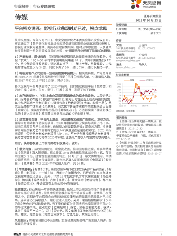 【天风证券】【20191023】传媒行业专题研究:平台招商洞悉:影视行业悲观时期已过,拐点或现-15页 行业研究