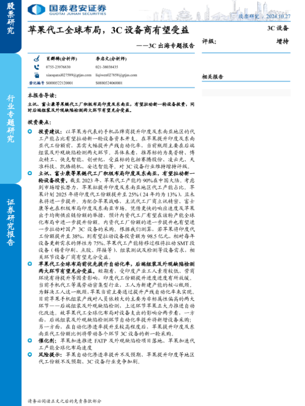 【国泰君安证券】【20241027】3C设备行业3C出海专题报告:苹果代工全球布局,3C设备商有望受益-23页 行业研究