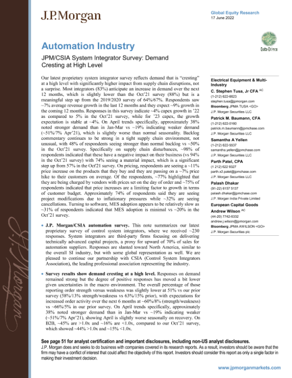 【J.P. Morgan】【20220617】JPM/CSIA System Integrator Survey Demand Cresting at High Level-58页 行业研究