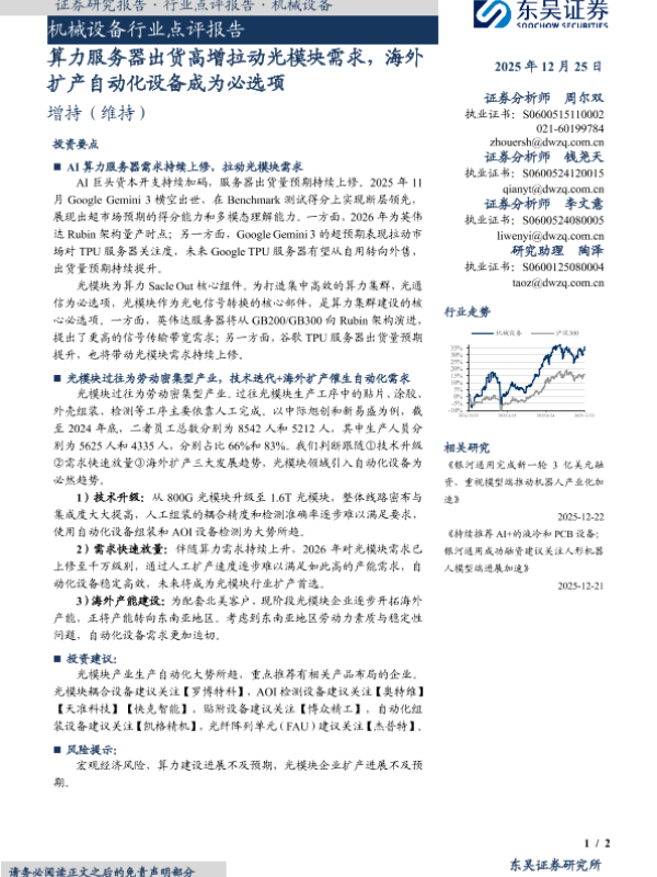 【东吴证券】【202512】算力服务器出货高增拉动光模块需求,海外扩产自动化设备成为必选项-2页 证券期货研究报告
