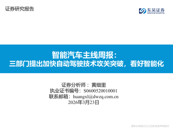 【东吴证券】【202603】智能汽车主线周报:三部门提出加快自动驾驶技术攻关突破,看好智能化-14页 证券期货研究报告