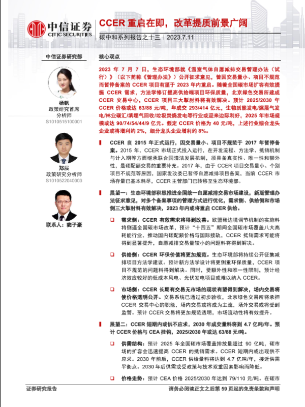 【中信证券】【20230713】双碳政策解读:CCER重启在即,改革提质前景广阔-18页 行业研究