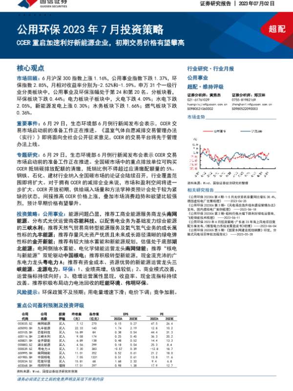 【国信证券】【20230702】公用环保2023年7月投资策略:CCER重启加速利好新能源企业,初期交易价格有望攀高-30页 行业研究