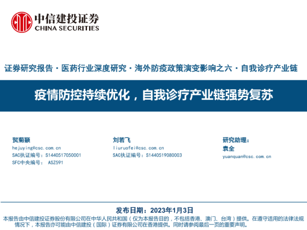 【中信建投证券】【20230103】医药行业海外防疫政策演变影响之六·自我诊疗产业链:疫情防控持续优化,自我诊疗产业链强势复苏-61页 行业研究