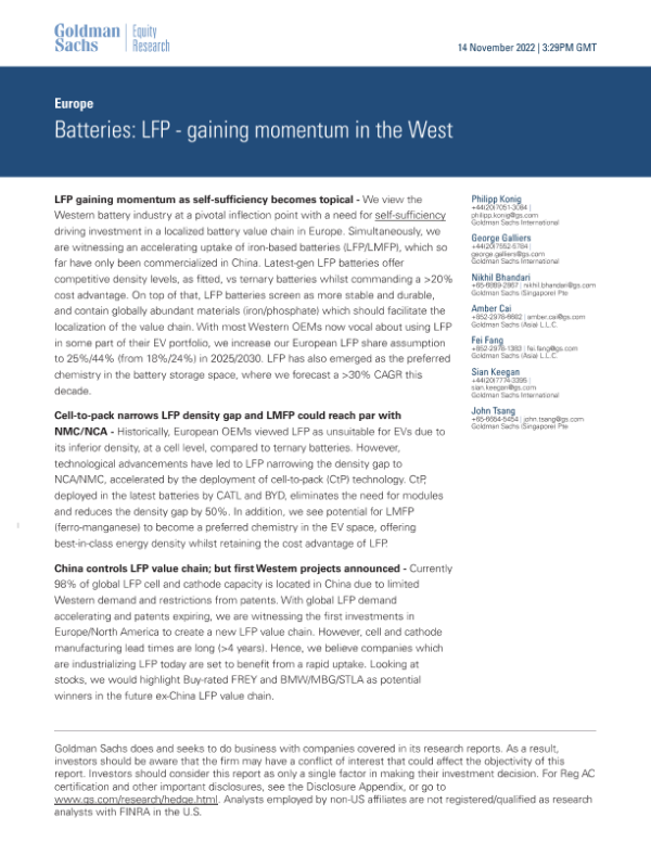 【Goldman Sachs】【20221114】Europe_ Batteries_ LFP - gaining momentum in the West-19页 行业研究