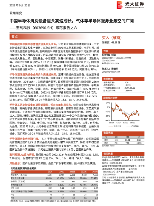【光大证券】【20220920】中国半导体清洗设备巨头高速成长,气体等半导体服务业务空间广阔——至纯科技(603690.SH)跟踪报告之六-26页 行业研究