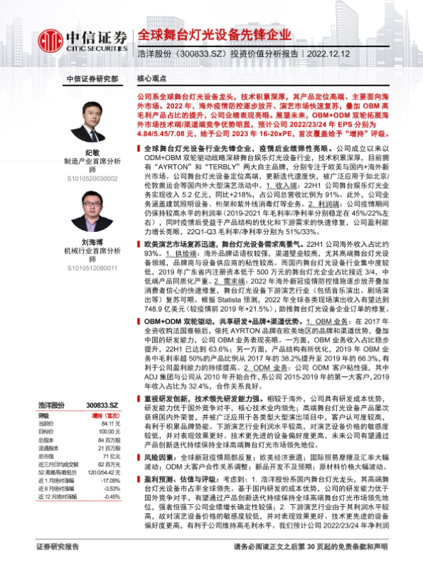 【中信证券】【20221212】20221212-中信证券-浩洋股份-300833-投资价值分析报告:全球舞台灯光设备先锋企业-31页 行业研究