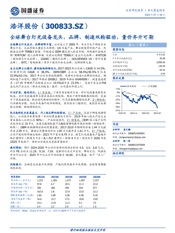 【国盛证券】【20240709】浩洋股份全球舞台灯光设备龙头,品牌、制造双轮驱动,量价齐升可期-20页 公司研究