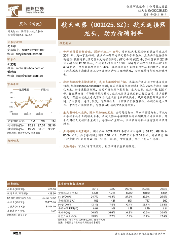 【德邦证券】【20210816】航天电器(002025.SZ) 航天连接器龙头,助力精确制导-23页 行业研究