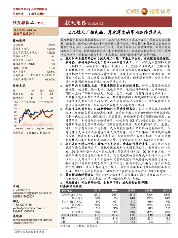 【海通证券】【20191229】立足航天开拓民品,厚积薄发的军用连接器龙头-34页 公司研究