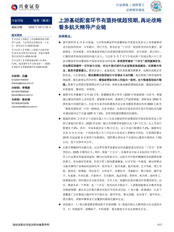 【兴业证券】【20250323】20250323-兴业证券-国防军工行业周报:上游基础配套环节有望持续超预期,再论战略看多航天精导产业链-17页 行业研究