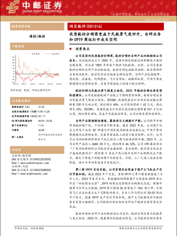 【中邮证券】【20230822】润贝航科(001316)优质航材分销商受益于民航景气度回升,自研业务和C919商运打开成长空间-23页 行业研究