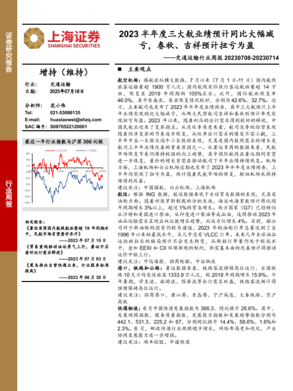 【上海证券】【20230718】2023半年度三大航业绩预计同比大幅减亏,春秋、吉祥预计扭亏为盈-12页 行业研究