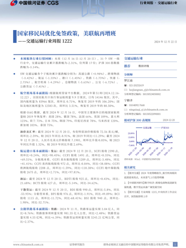 【银河证券】【20241222】交通运输行业周报:国家移民局优化免签政策,美联航再增班-21页 行业研究