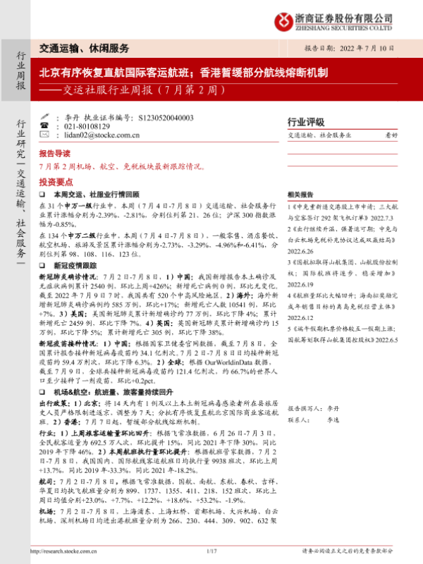 【浙商证券】【20220710】交运社服行业周报:北京有序恢复直航国际客运航班;香港暂缓部分航线熔断机制-17页 行业研究