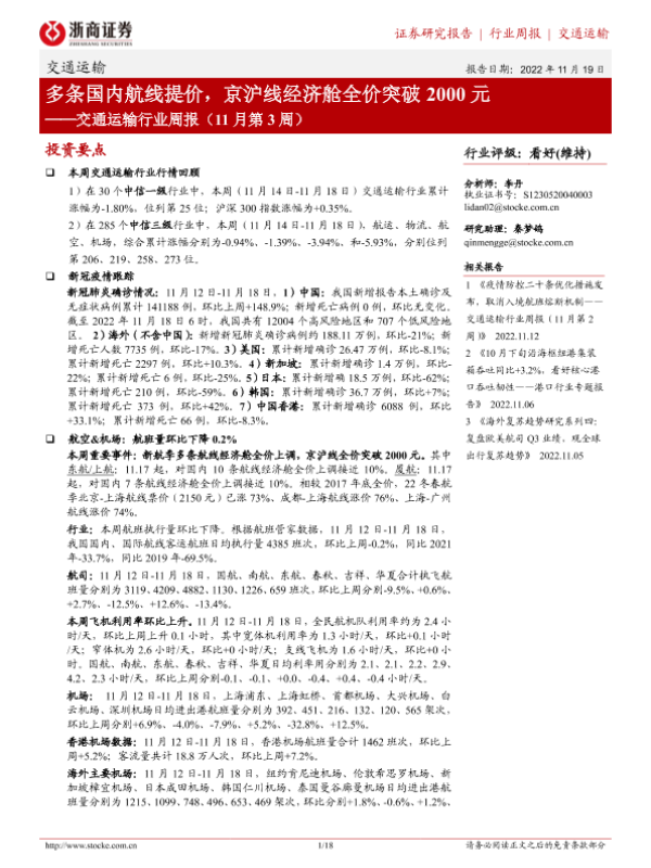 【浙商证券】【20221119】多条国内航线提价,京沪线经济舱全价突破2000元-18页 行业研究