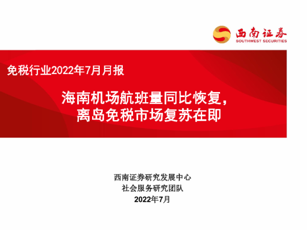 【西南证券】【202207】免税行业2022年7月月报:海南机场航班量同比恢复,离岛免税市场复苏在即-25页 行业研究
