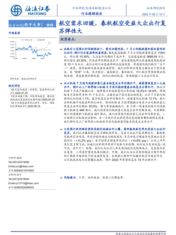 【海通证券】【20200810】交通运输行业跟踪报告:航空需求回暖,春秋航空受益大众出行复苏弹性大-4页 行业研究