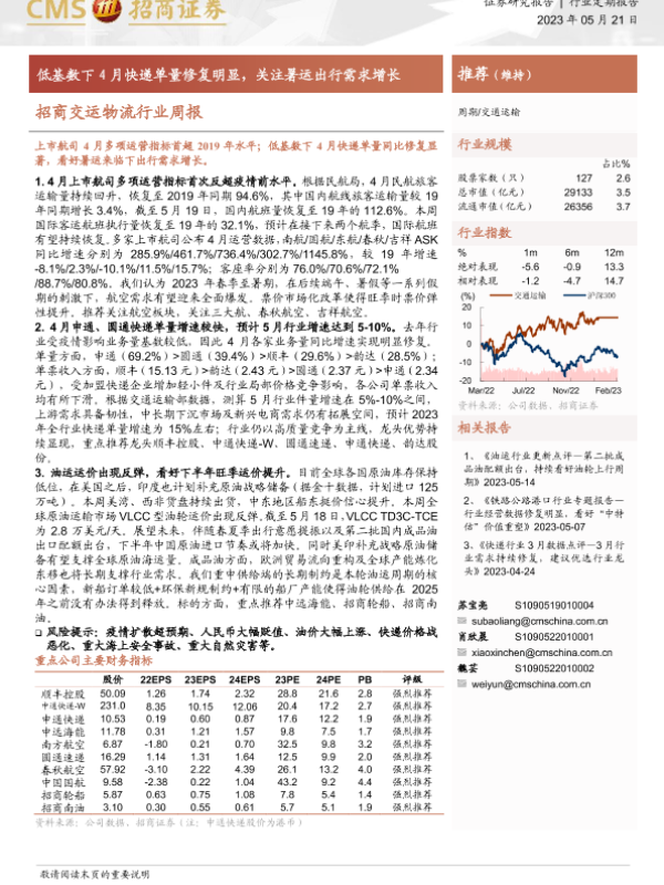 【海通证券】【20230521】招商交运物流行业周报:低基数下4月快递单量修复明显,关注暑运出行需求增长-17页 行业研究